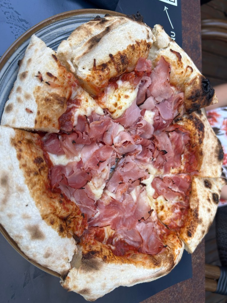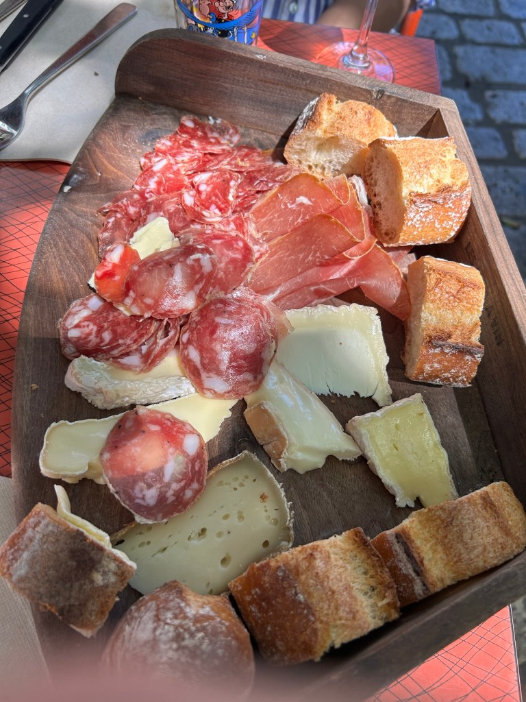 We went for a walk in the old part of town and stopped for lunch at an outdoor cafe. There were lots of place to get international food but this place was French. We got a bottle of wine, a charcuterie board, a mozzarella salad and an egg dish. All were very good. Afterwards we went into a toy store and then walked back to the bnb, stopping to take pictures of the cathedral. I was too tired to go into the cathedral. At the bnb, I took a nap.