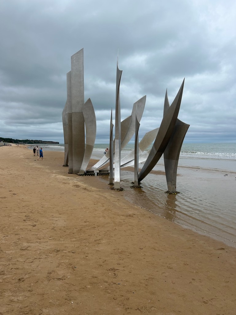 Got up today and headed to Omaha Beach after breakfast. France has a lot of round abouts, the most in the world at 42,986, and we must have hit at least 50 of them. the country side was pretty, lots of cows, sheep, horses and even some donkeys. At the beach we got out and walked a bit. There were two monuments, but not much in the way of historical narrative that we could figure out the events, so we went to the internet to find out more.