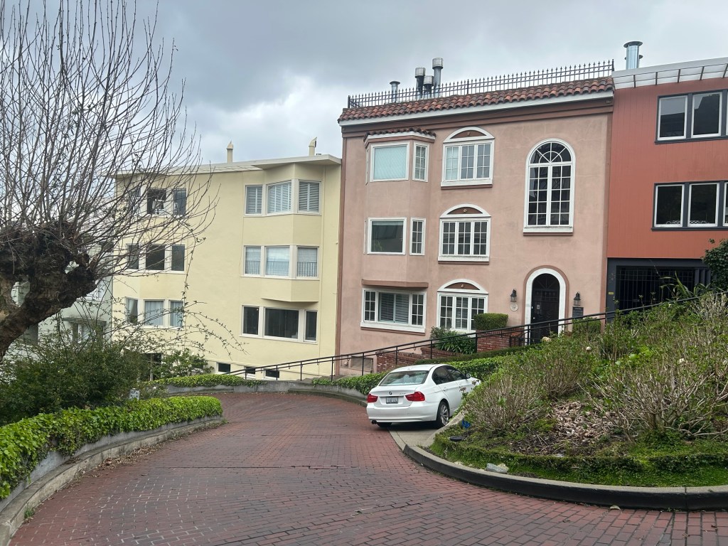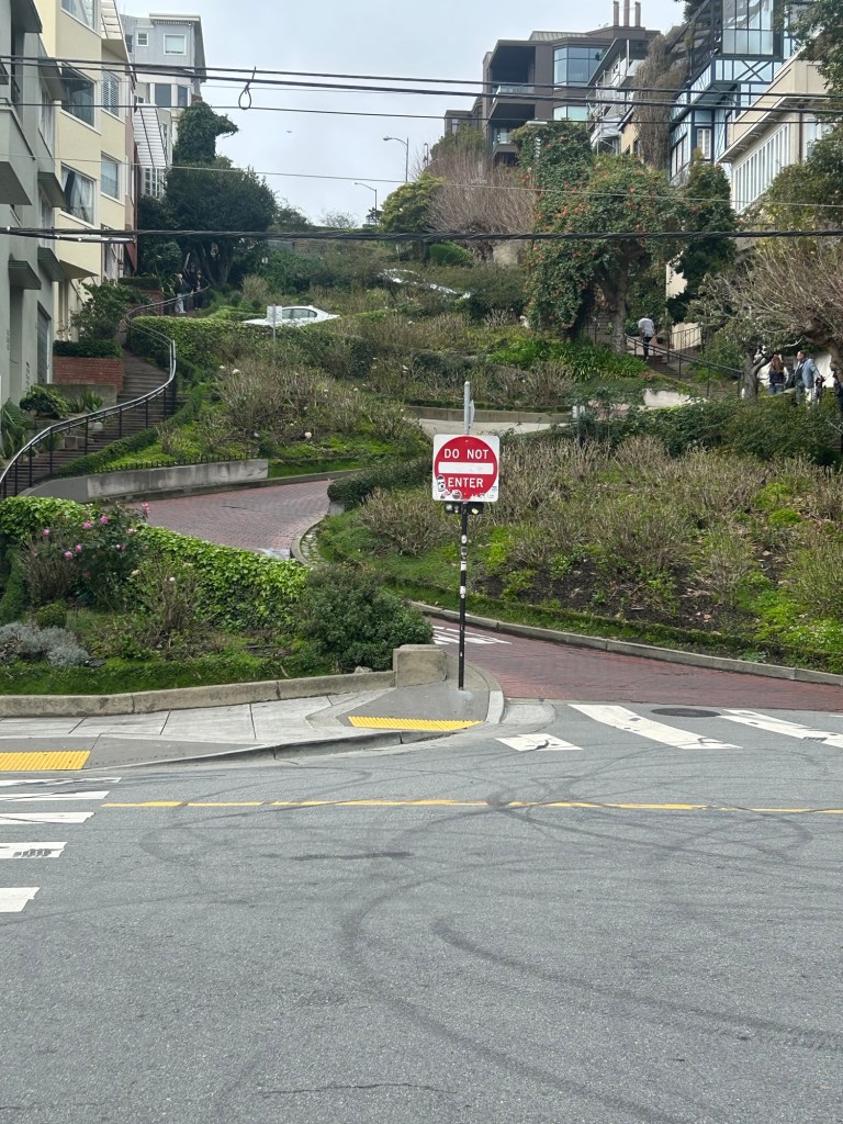 Last day in San Francisco. I got up and took the cable car to the wharf, stopping at Lombard St. I was lucky for it stopped right at the top of the crooked part and it sure was crooked. I walked down the side walk, which was straight, taking videos of the cars as they went down. I was lucky when two skate boarders decided to go down and got some good video of them. They went down twice while I was there and I gave them copies of what I recorded.